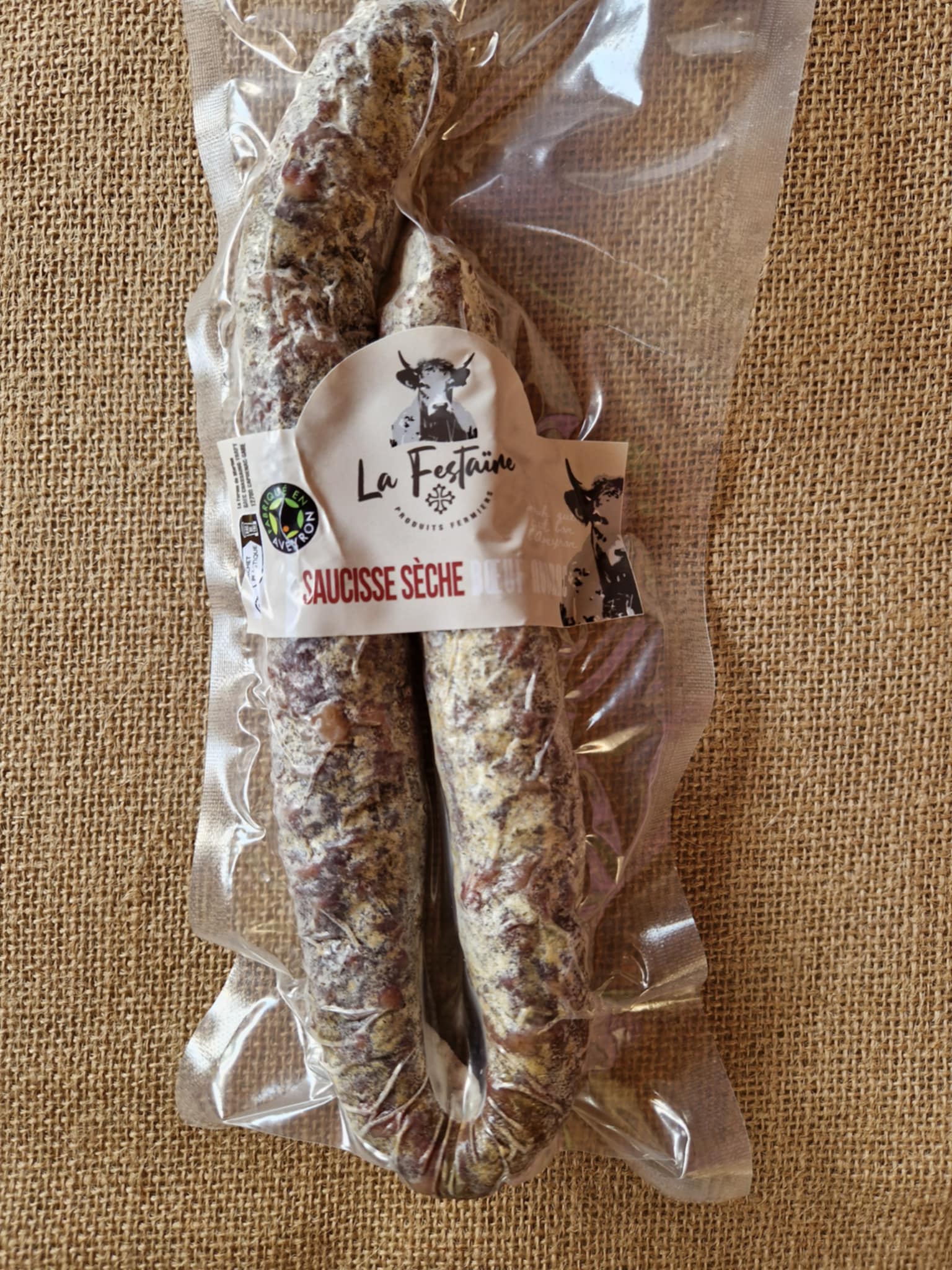 Élaborée avec des morceaux soigneusement sélectionnés, notre saucisse sèche est assaisonnée de sel fin, de poivre noir bio moulu et d’une touche de sucre roux bio. Séchée lentement, elle offre une saveur authentique et une texture généreuse, parfaite pour vos apéritifs et plateaux de charcuterie.